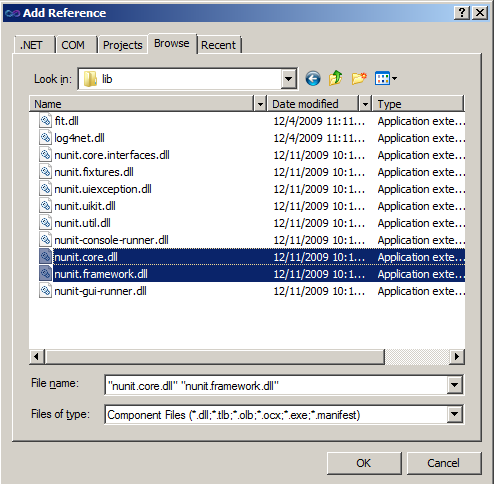 Once the project is created, add the NUnit dlls (nunit.core.dll and nunit.framework.dll) to integrate NUnit with .NET. Right click on References and click Add Reference.